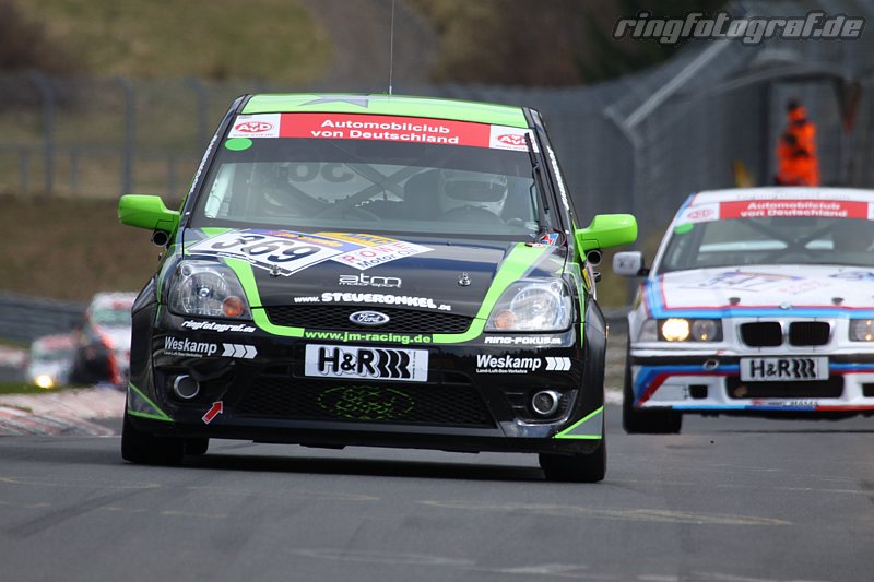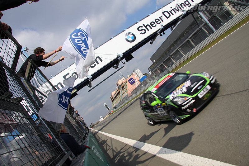 Ernst Berg übernahm den Start und holte sich schon kurz darauf Platz zwei der Klasse. In der Folge hielt er einen konstanten Abstand zum Klassenprimus, bevor dieser in Runde sieben einer Kollision zum Opfer fiel und neben der Führung auch viel Zeit einbüßte. Als Berg nach zwei Stunden das Steuer des Ford Fiesta ST in Führung liegend an Jana Meiswinkel übergab, war der zweitplatzierte Citroen Saxo bereits um rund zwei Minuten distanziert. Den lang ersehnten Klassensieg vor Augen biss die Wilnsdorferin angesichts ihres angeschlagenen Gesundheitszustandes die Zähne zusammen und fuhr den allerersten Sieg bei den VLN-Specials bis 1750ccm routiniert ins Ziel. Hier brachen dann im gesamten Team sämtliche Dämme, Worte fand kaum jemand für diesen unerwarteten, wenn auch längst überfälligen Erfolg. „Nach gefühlten 100 Anläufen haben wir es endlich geschafft, aber vor allem bei diesem Rennen haben wir eigentlich gar nicht damit gerechnet. Vielen, Vielen Dank ans Team“, erklärt eine durch Sektdusche bereits klatschnasse und überglückliche Jana Meiswinkel kurz nach dem Rennen, „wir hatten am Fahrwerk ein paar Sachen geändert und waren damit sehr zufrieden. Wir sehen noch viel Potenzial im Auto und sind auf der richtigen Spur, dieses auszuschöpfen.“