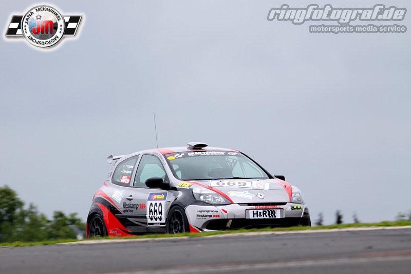 Ernst Berg übernahm den Start auf dem roten „Jacques", Gastfahrer Carsten Erpenbach nahm hinter dem Steuer des silbergrauen „Jean-Pierre" Platz. Während Berg Position um Position gutmachen konnte und sich vom 19. Startplatz in der Klasse in Richtung Top 10 vorkämpfte, war für Erpenbach nach vier Runden und einem unverschuldeten Unfall Schluss. „Jacques" lief weiterhin perfekt, wie Startfahrer Berg später bestätigt: „Das Auto war einfach super, die Entwicklung des Autos geht in die richtige Richtung und das Team hat einen perfekten Job gemacht." Der Lohn der Teamarbeit: In 9:55,086 fuhr Berg die erste Rennrunde unter zehn Minuten! „Das hätte aber auch eine 9:50er Runde werden können", so Berg, der mit der Gegnerschaft haderte. Diese fuhr aggressiv wie nie, was letztendlich einen schweren Unfall bei einsetzendem Regen nach sich zog. Der erste Rennabbruch nach rund anderthalb Stunden war somit unumgänglich.