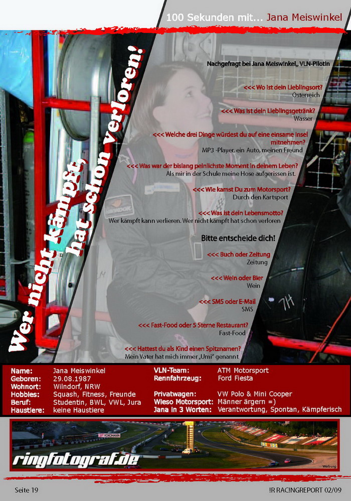 100sek mit Jana MeiswinkelErstellt: Sonntag, 26. April 2009 01:00Jana Meiswinkel im 100sek Interview für das Magazin !R RAC!NGREPORT 02/09: Die Vollständige Ausgabe finden Sie unter: http://issuu.com/insideracing/docs/racingreport_lauf2